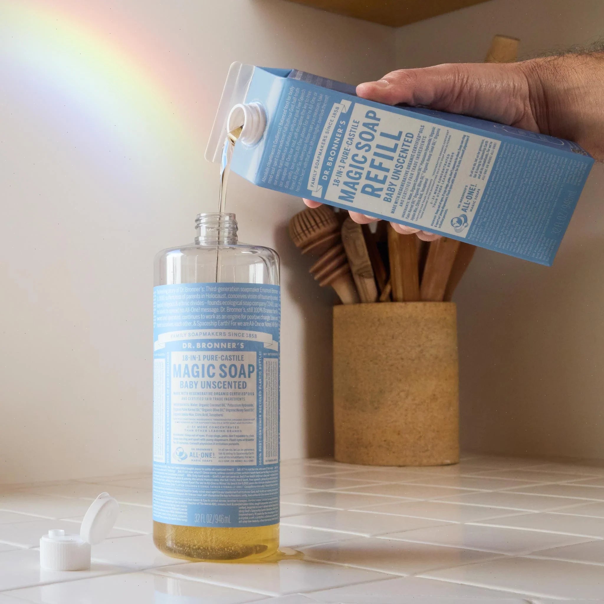 Refill your Dr. Bronner’s 100% Post-Consumer-Recycled bottle, foaming hand soap pump dispenser, and more with our 32oz. Magic Soap Refill Paper Carton! Uses 86% less plastic than one of our 32oz. recycled bottles! Sustainable made easy!