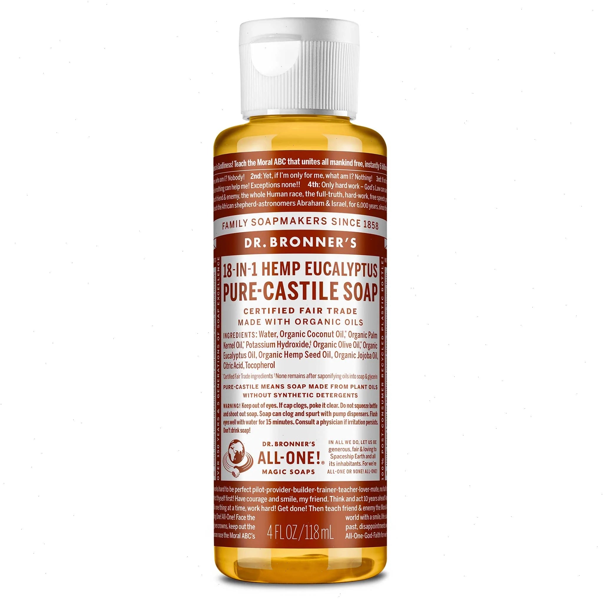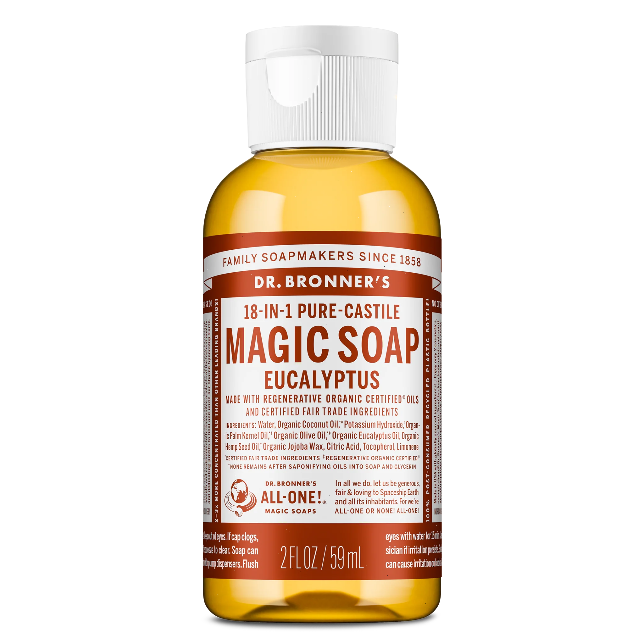 Breathe deep and refresh your senses with Dr. Bronner’s Eucalyptus Liquid Soap. Infused with pure eucalyptus essential oil, this true soap renews body and soul leaving you feeling refreshed. Made with Regenerative Organic Certified® oils, it creates a rich, smooth lather that rinses clean. No detergents, dyes, or added foaming agents. Vegan, made with organic oils, and fair trade for peace of mind—a clean that’s good for you and the planet!